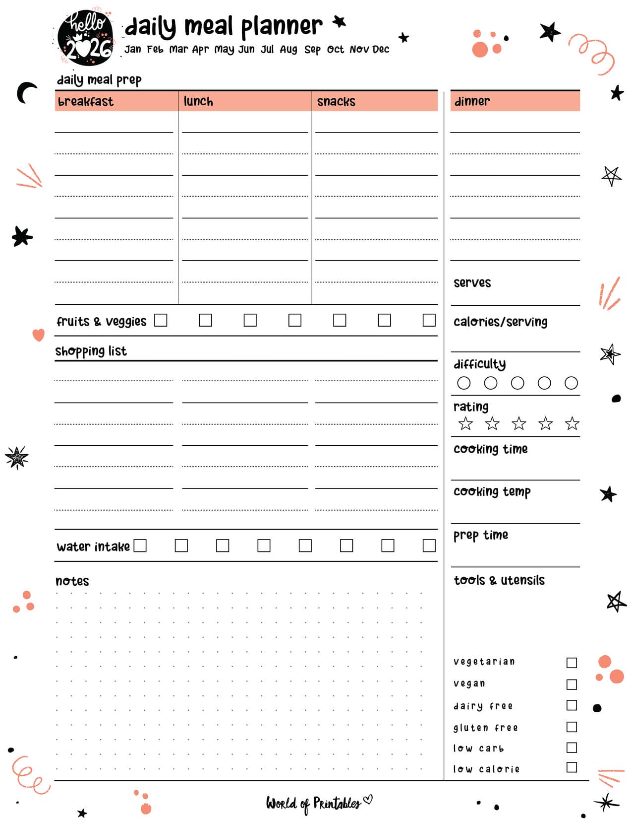 Use this cute meal planner printable to write the meals that you want to prepare today. There’s space for breakfast, lunch, dinner, and snacks. You can also use it to make sure you and your family are eating enough fruit and vegetables, as well as drinking enough water. It also has space for a shopping list, recipe plan, and cooking instructions.