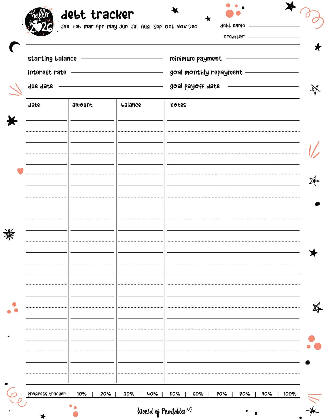 Use this cute debt tracker printable to keep track of any debts that you have so that they don’t get out of hand. You can use it as a way to log your debt repayments and as a goal for paying them off. There’s space to write down the debt amount, interest rate, due dates, payment amounts, and more. It’s a great way of seeing your debts decreasing over time and will encourage you to pay off your debts more quickly.