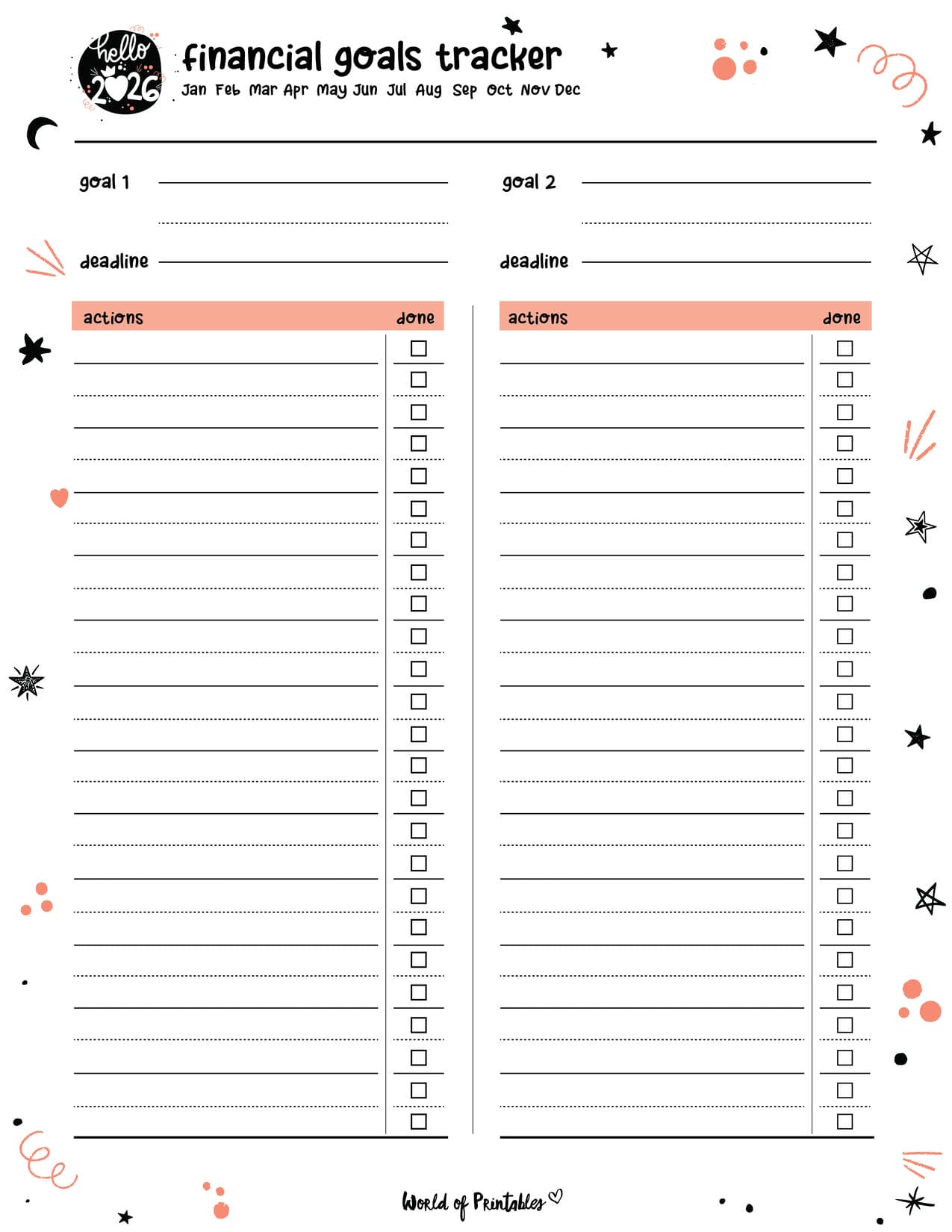 If you’re someone who likes to set financial goals, then you’ll love this cute money goal tracker template. You can write down your money goals for the month or year, any actions that you’re taking towards achieving them, and deadlines for when you want to reach them.