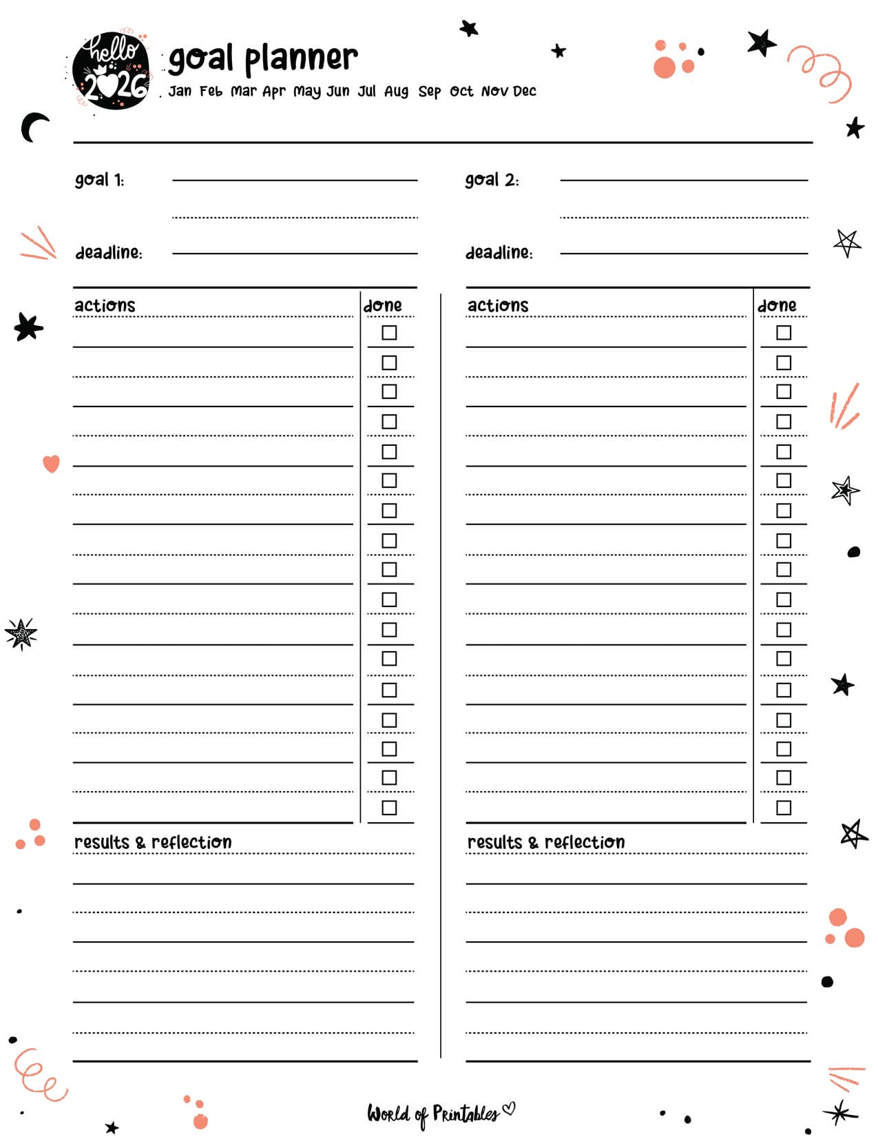 Set yourself some goals for 2026 with this cute 2026 goal planner printable. There’s space to write down your goals, set yourself some deadlines, and all of the things that you need to do to achieve your goals. You can reflect on the results at the end when you’ve achieved your goal so that you can stay motivated and encouraged to set more goals in the future.