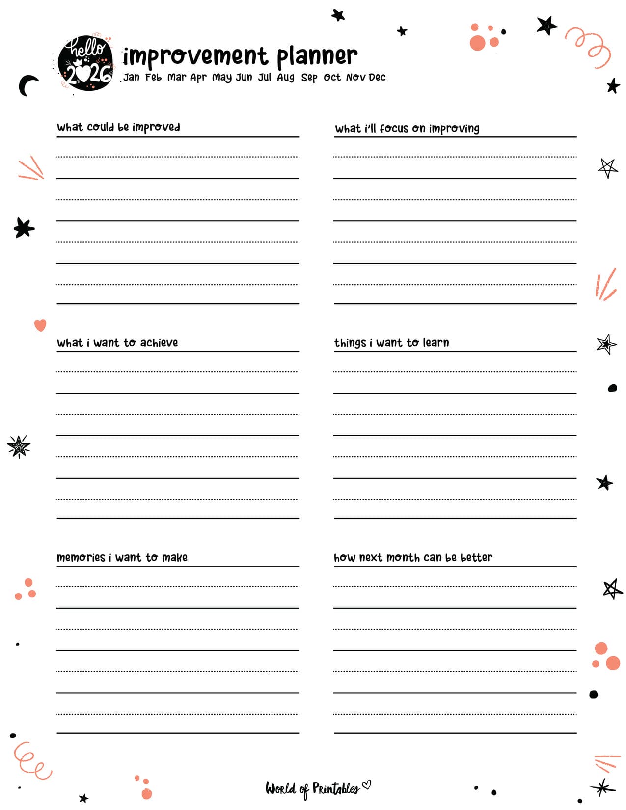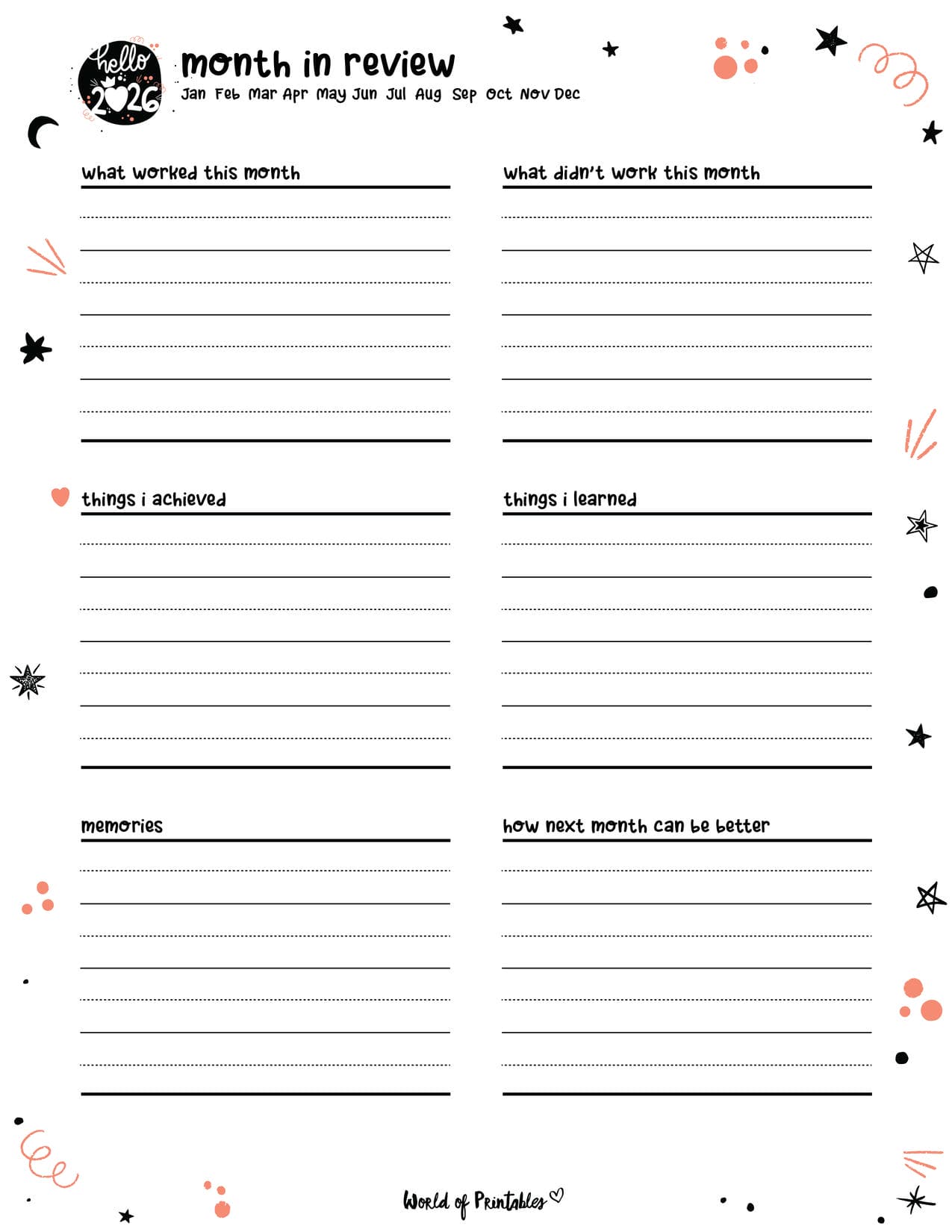 This cute planner page is a great printable to use to help you review each month. It’s a great way to reflect on what’s gone well and what could have gone better. You can write down what worked this month, what didn’t work well this month, things that you achieved, things that you learned, memories, and much more. You can also use it as a way of seeing what you can do to make next month better.