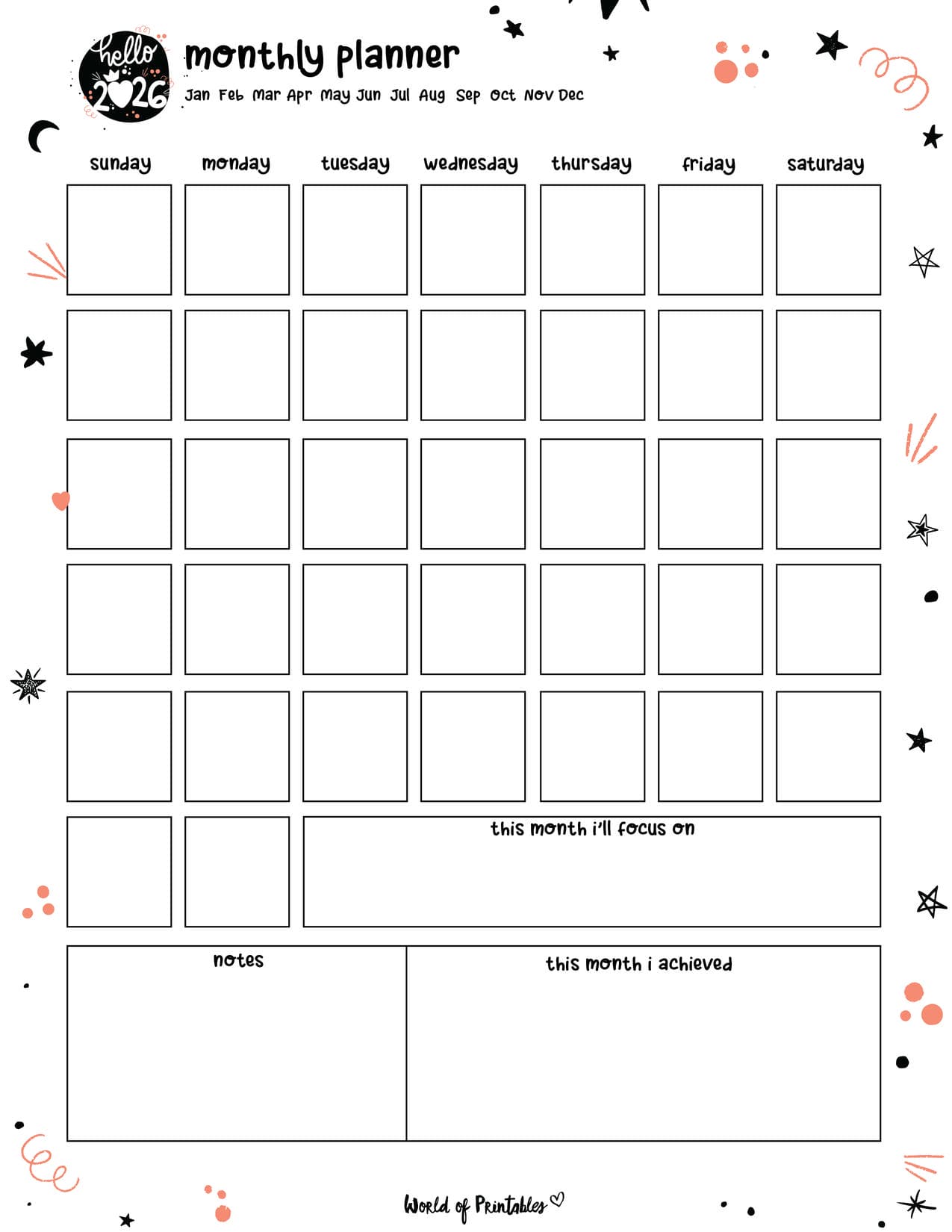 If you’re looking for cute calendars for 2026, then this cute blank month planner is exactly what you need to plan the month ahead in style. This aesthetic month planner can be used for any month of the year and features plenty of space to write dates, events, appointments, and more. There’s also space to write down what you’ll focus on this month, notes, and anything you’ve achieved over the course of the month.