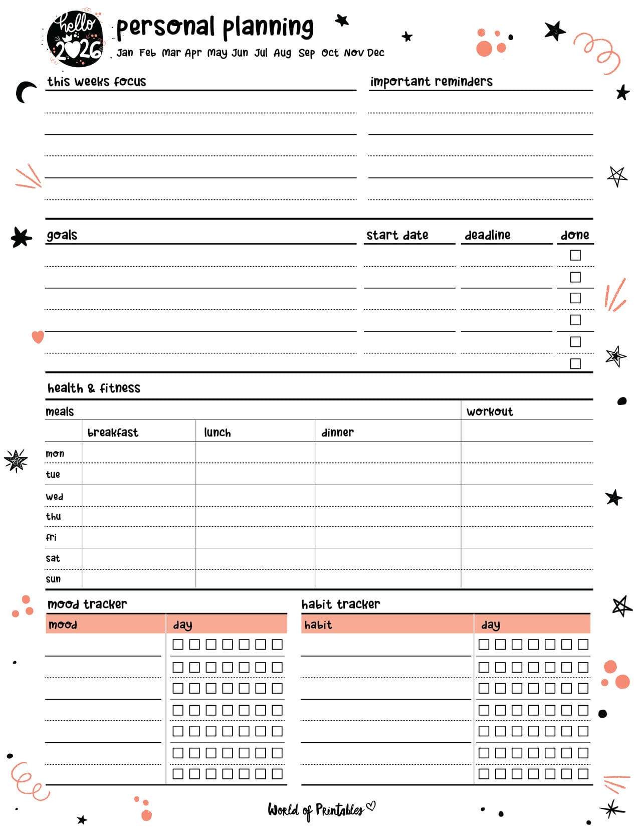 Use this cute personal planner to write down your upcoming tasks goals, and reminders. You can also log your meals, workouts, moods, and habits. It’s a great planner page to focus on your own personal day-to-day life. We all need to focus on our eating, health, moods, and habits and this printable planner page helps you do just that.