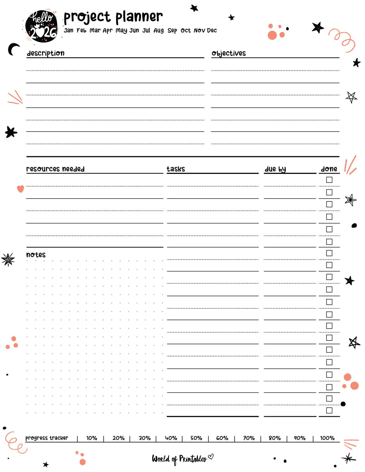 Use this cute project planner printable to plan new projects and to progress through to completion. There’s space to write the project description, objectives, resources needed, tasks that need to be done, due dates, and more. You can also monitor your progress as you’re working on the project. It’s a great planner page for anyone who has personal projects, such as crafts or work-related projects and it will help you stay motivated and on track to completing them.