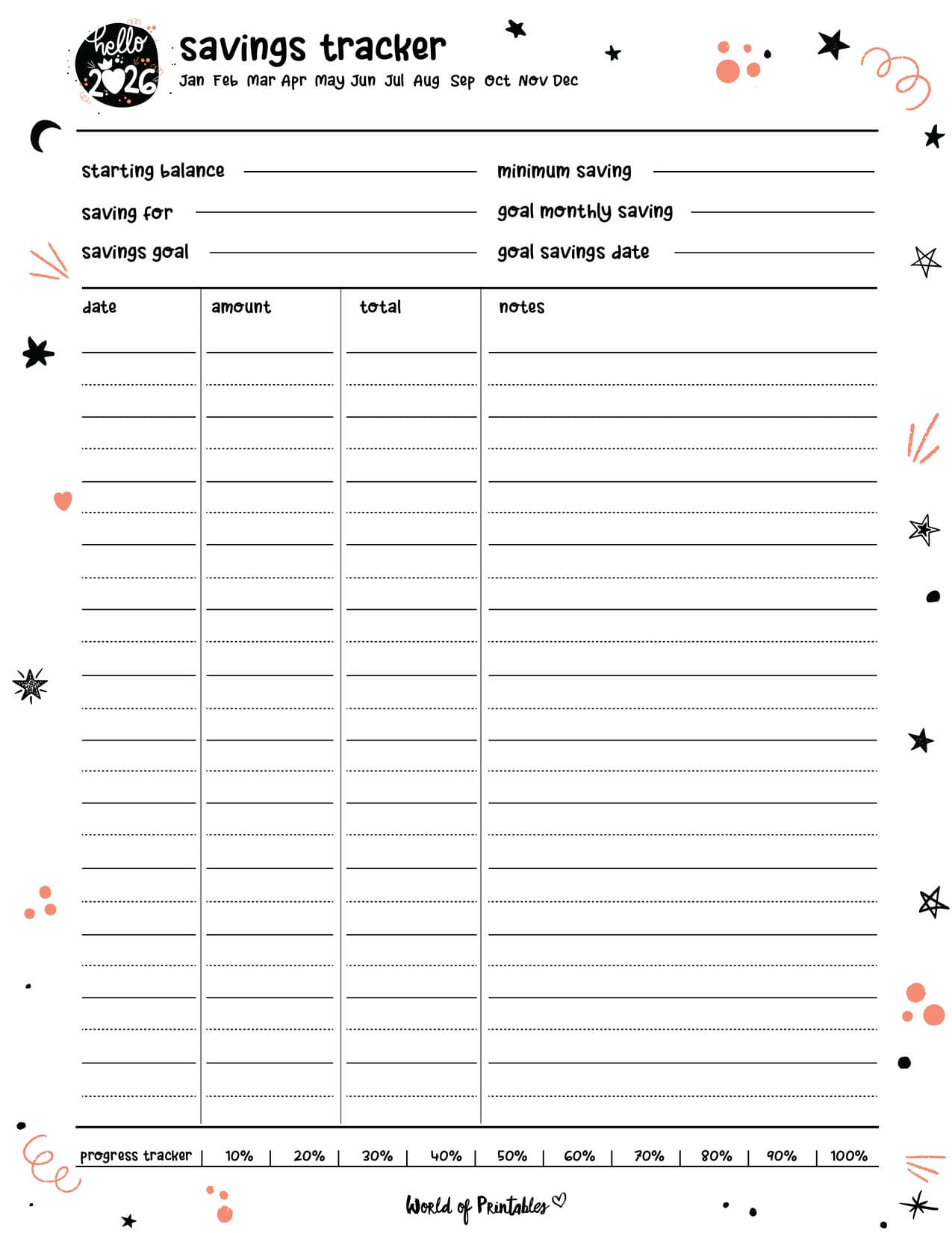 This cute savings tracker will help you keep track of your savings over the course of the month, each and every month. You can write down your starting balance, what you’re saving for, your savings goal, your minimal saving amount, and the dates for when you want to reach your savings goals. Every time you save some money, write it down on this savings tracker and you can track the progress as you go.