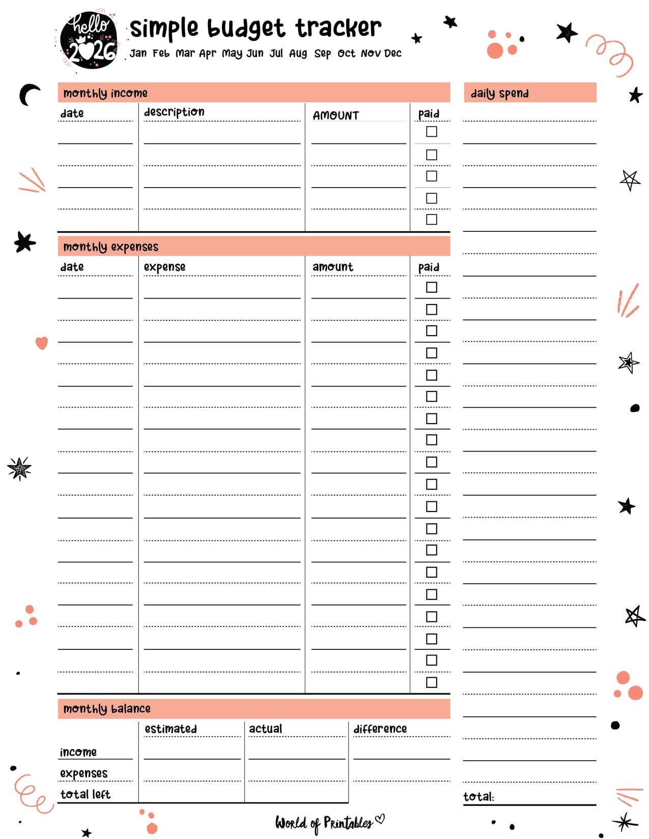 This cute budget tracker template is a fun printable that has what you need to keep track of your budget. You can write down your monthly income, monthly expenses, daily spending, and more.
