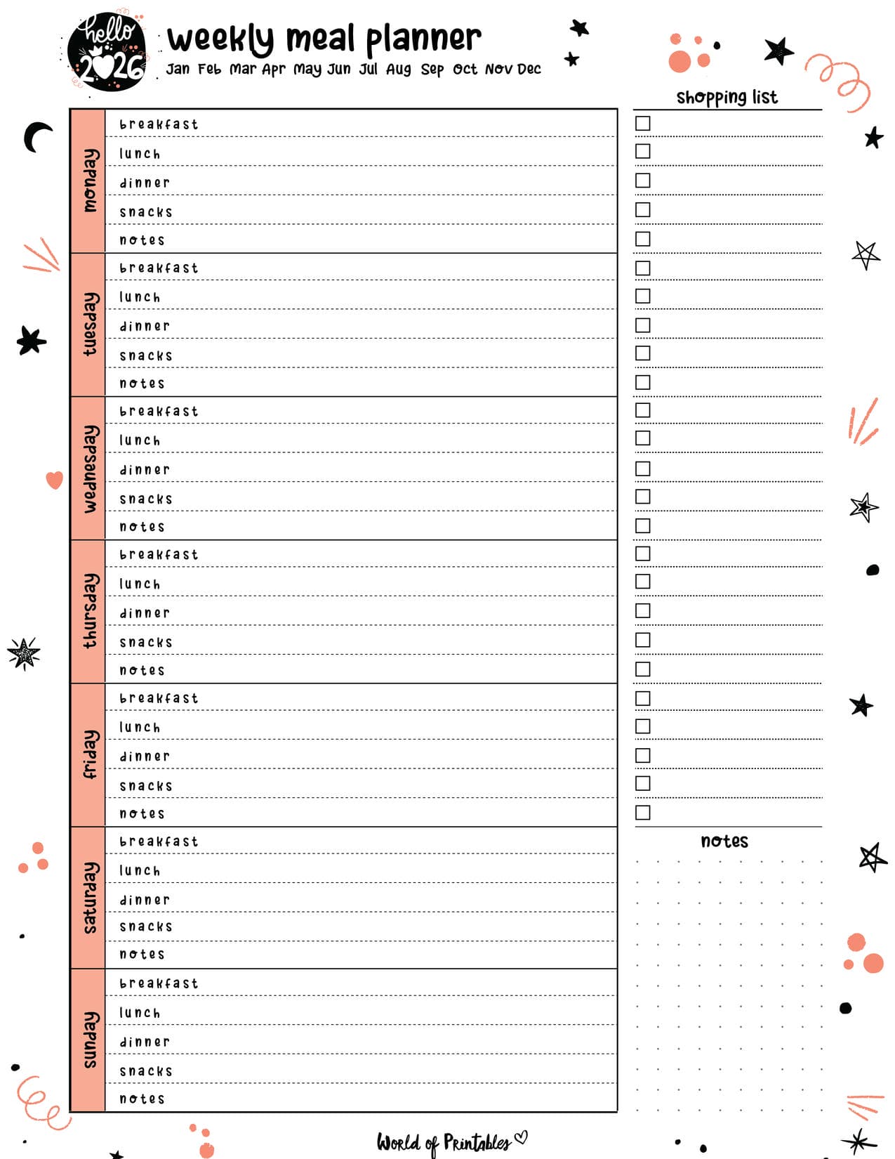 This cute weekly meal planner is great for anyone who likes to plan all of their meals for the week ahead. There’s also space for a shopping list and any notes that relate to the meals that you’re planning this week.