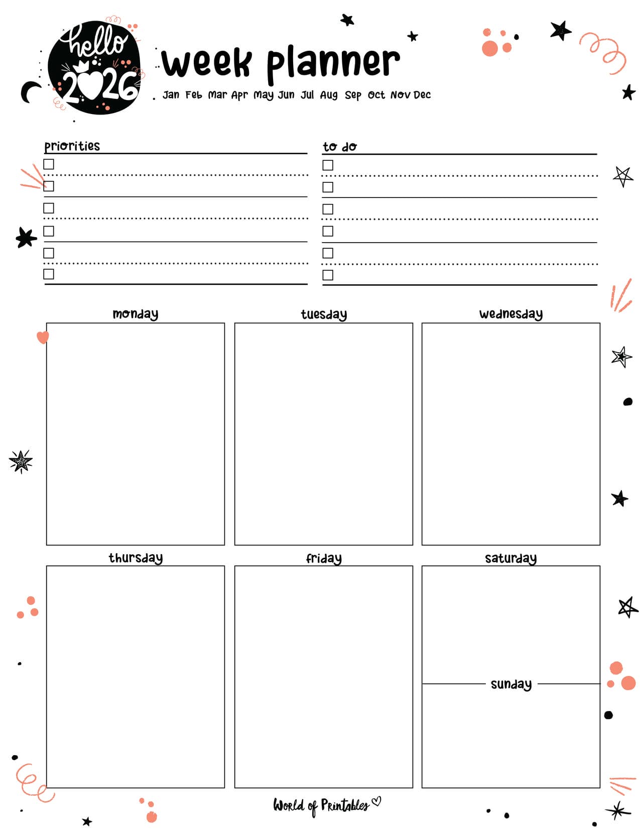 This printable cute weekly planner helps you plan and organize everything you need to do for the week ahead. You can write the priorities, to-do list, and activities, and also use the boxes for each day of the week to write down tasks and events specific to each day.