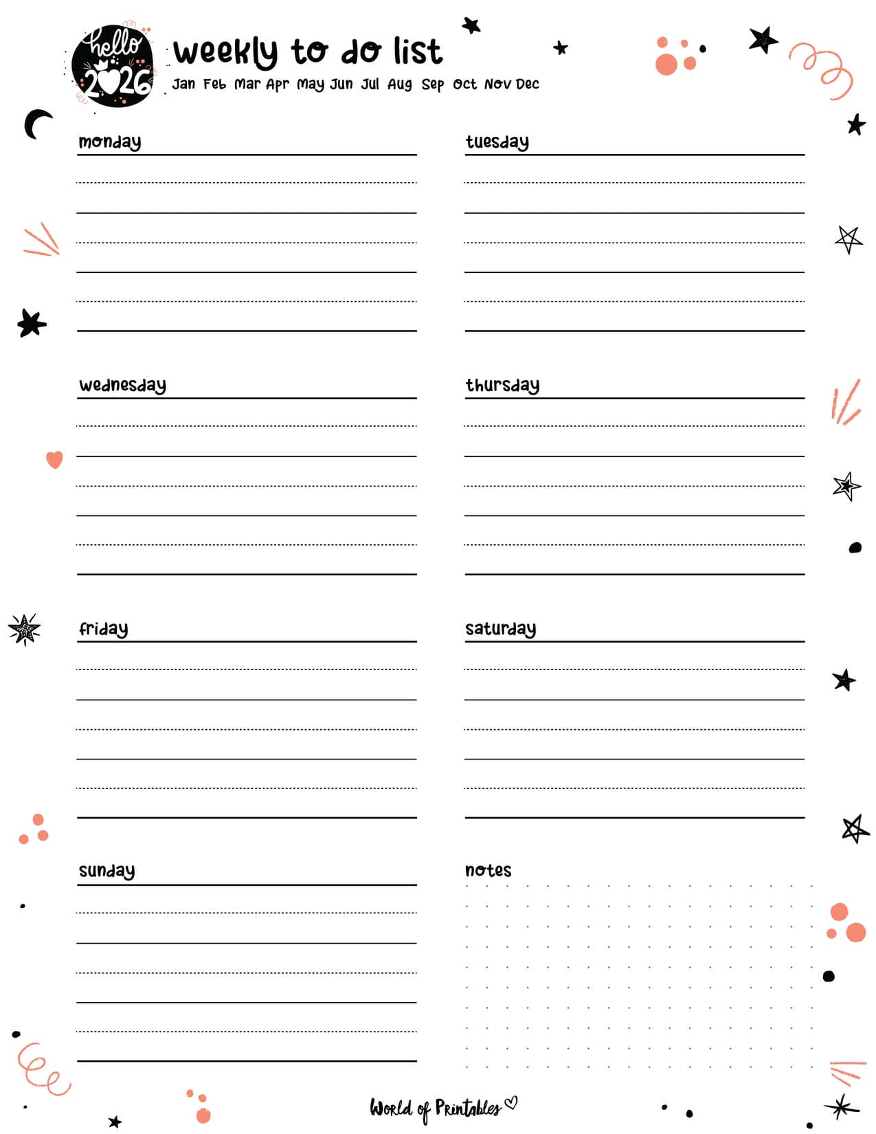 This free printable cute weekly to do list has space for you to write everything you need to do for each day of the week. Use it as a central place to keep track of all your tasks and commitments for the week, and track your progress as you complete each task.
