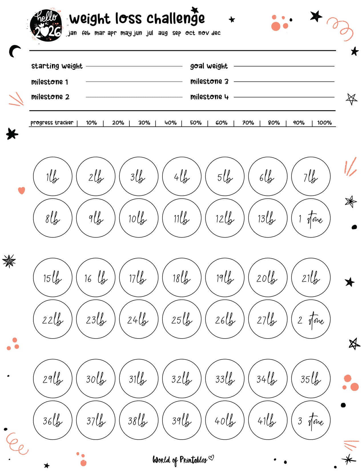 If your goal is to lose weight this year then use this cute weight loss challenge printable to help you reach your goal weight. This printable features your starting weight, goal weight, milestones, and more. You can score off the amount of weight you lose as you go and also check your progress over time.