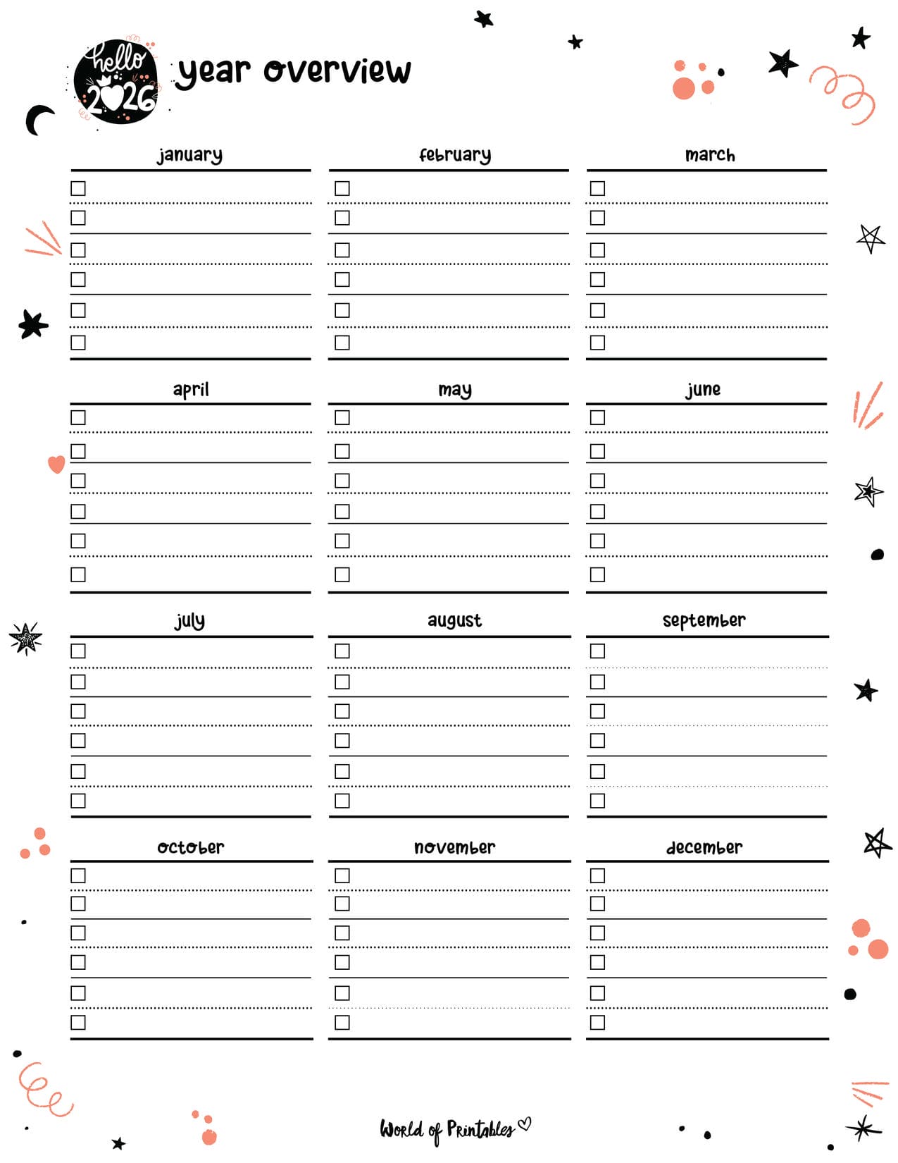 Use this cute 2026 year planner to plan your year ahead. You can write down events such as birthdays, holidays, weddings, and more in the spaces for each month of the year. You can also use the checkboxes to mark each event off when it’s done.