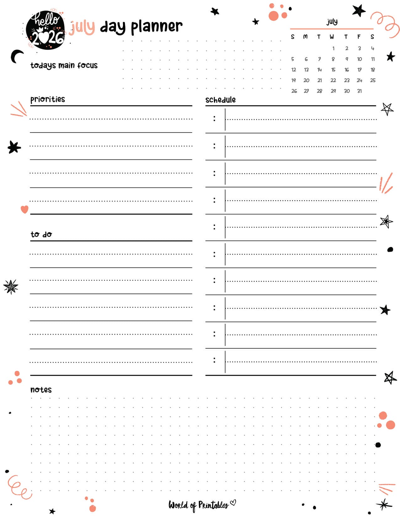 Use this to prioritize your daily to do’s, write notes, and get more done each day in July.