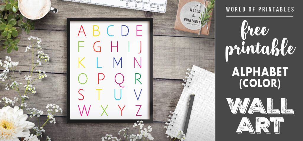 We love this free Alphabet Colored Art Print and think it would be a great addition to a playroom, nursery, or child’s room. If you home school or work with children, this print would also be a great study tool too. You can use this easy to read alphabet print to teach the alphabet.