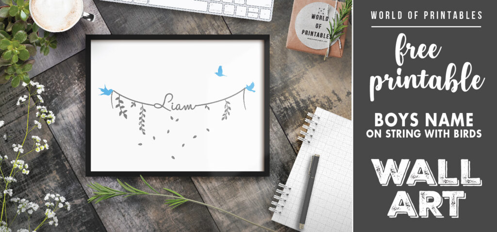 We totally love this free printable Boys Name On String With Birds Nursery Art print and it is such a popular choice. This gorgeous print comes in a variety of 50 names – see if yours is below!