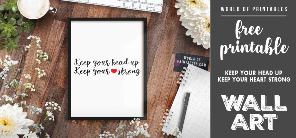 This free Keep Your Head Up art print is a perfect item for anyone whether they are a teen, a young adult, an adult, or elder. The phrase ‘keep your head up, keep your heart strong’ can resonate with anyone.