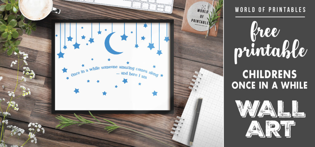 How lovely is this free printable Once In A While Someone Amazing Comes Along wall art print? It offers a beautiful night time scene of moon and stars with a cheeky, funny quote.