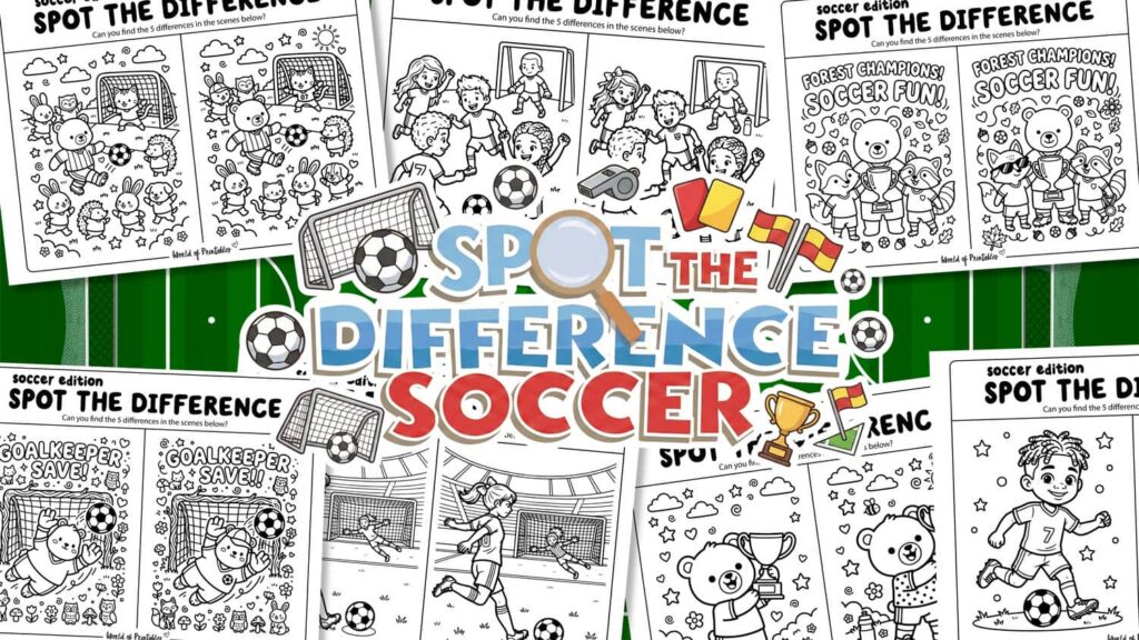 Because each page has 5 differences to find, these soccer spot the difference games work especially well for younger kids, preschoolers, kindergarten activities, and early elementary ages. Browse the collection below and print your favorite pages to use at home, in the classroom, or as part of a soccer-themed activity pack.